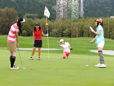 丘陵コース。リゾート特有のゆったりした景観で、のびのびとドライバーショットが楽しめる。しかし2打以降はかなりの慎重さが必要だ。微妙なライの変化があって漫然と打つとトップやダフリが出やすい。そしてグリーンはさらに注意が必要。ほとんどが、900平方メートルもあるため一見平坦にみえても、かなりアンジュレーションがあるからだ。ラフは粘っこくクラブの抜けが悪いので、パワーが足りないと苦労する。なお、高地のためボールは平地よりだいたい1クラブ分よけいに飛ぶ。アンダークラビングで攻めたい。